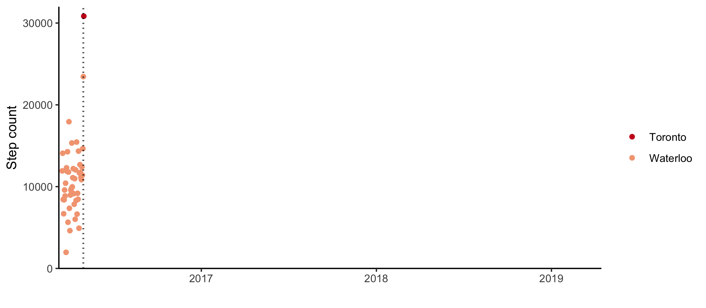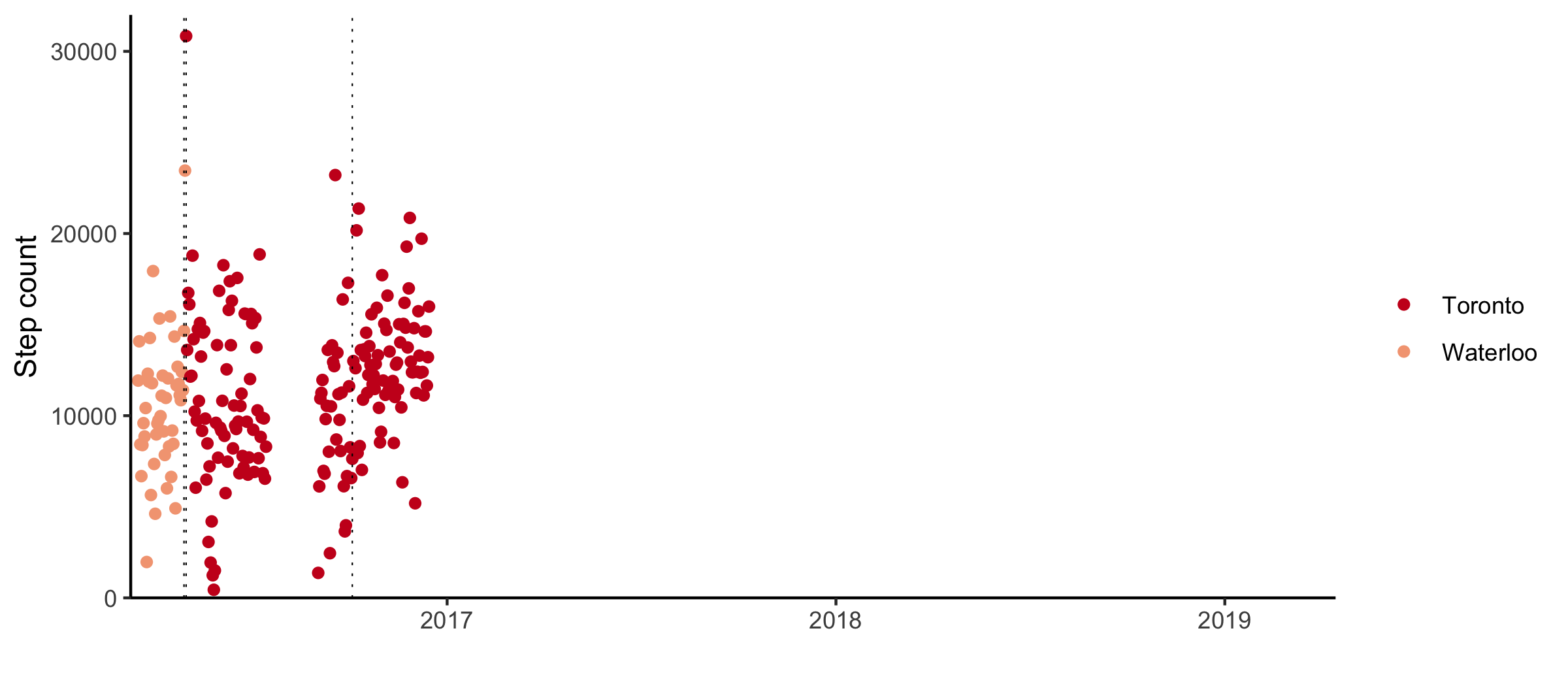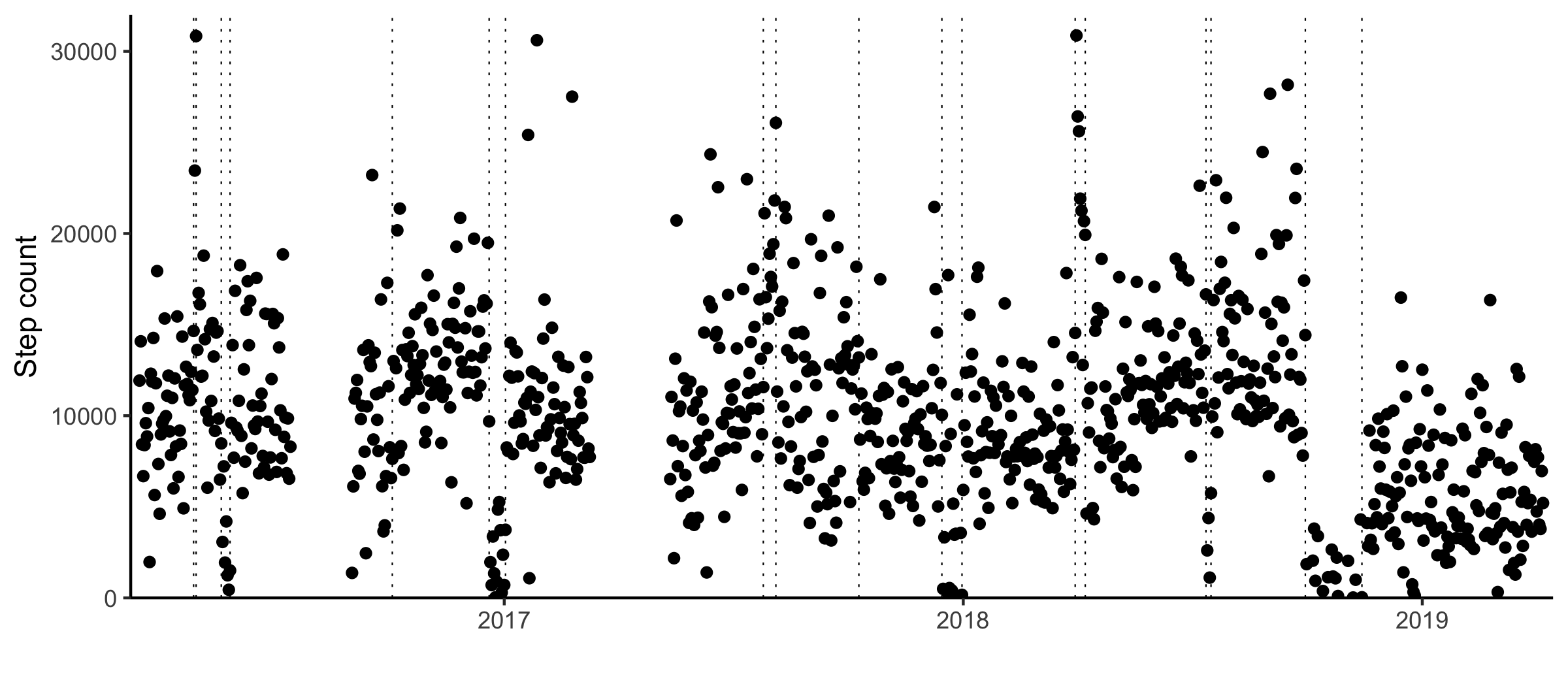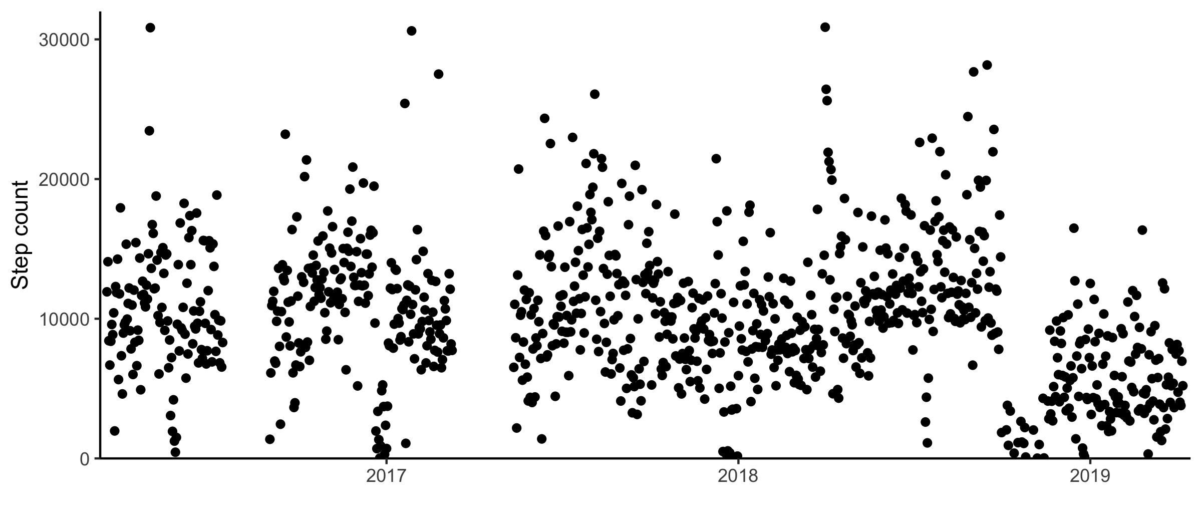 I got my phone in the winter of 2016. For the most part, my phone has been kept collecting data since. There was one period in 2016 and one in 2017 where the step counting was turned off.