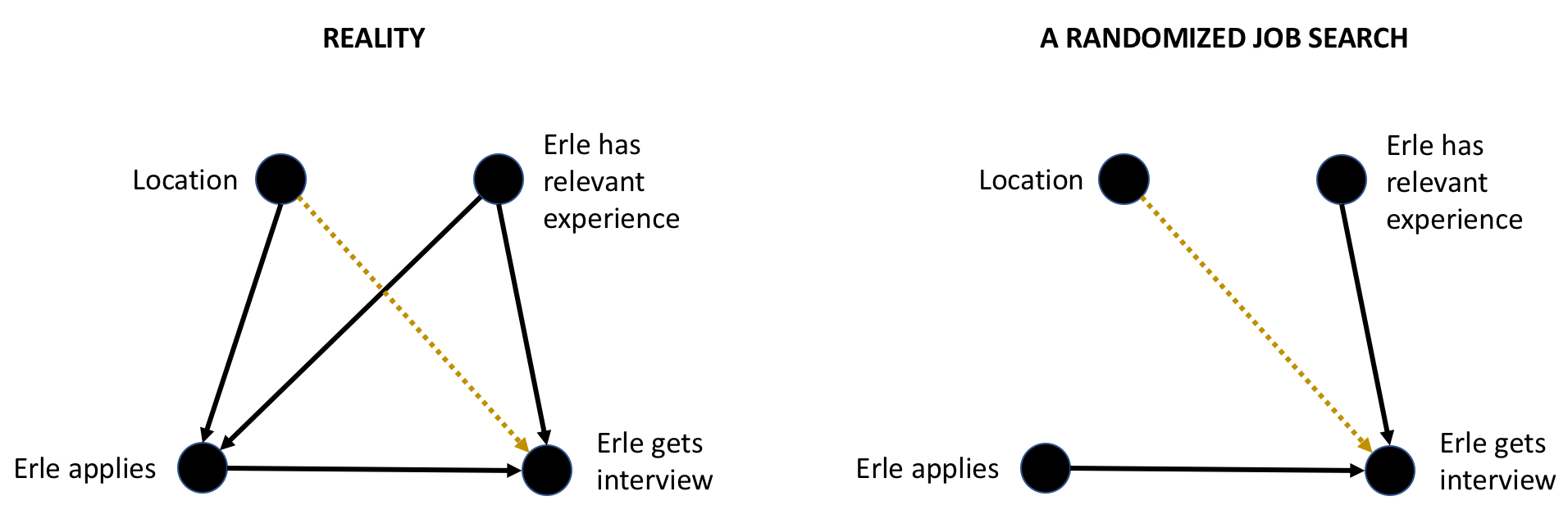 Of course, there was no randomization in my job search. I applied to most data-related jobs I could find in Toronto, and only jobs I was really excited about elsewhere. In causal inference terms, my decision to apply for a job was a collider. It was influenced both by the location of the job, and whether I had any relevant experience.