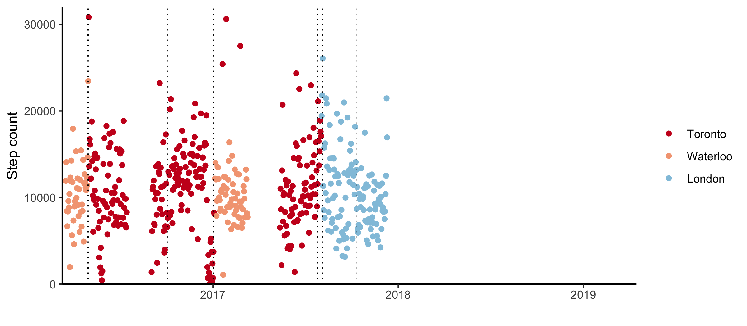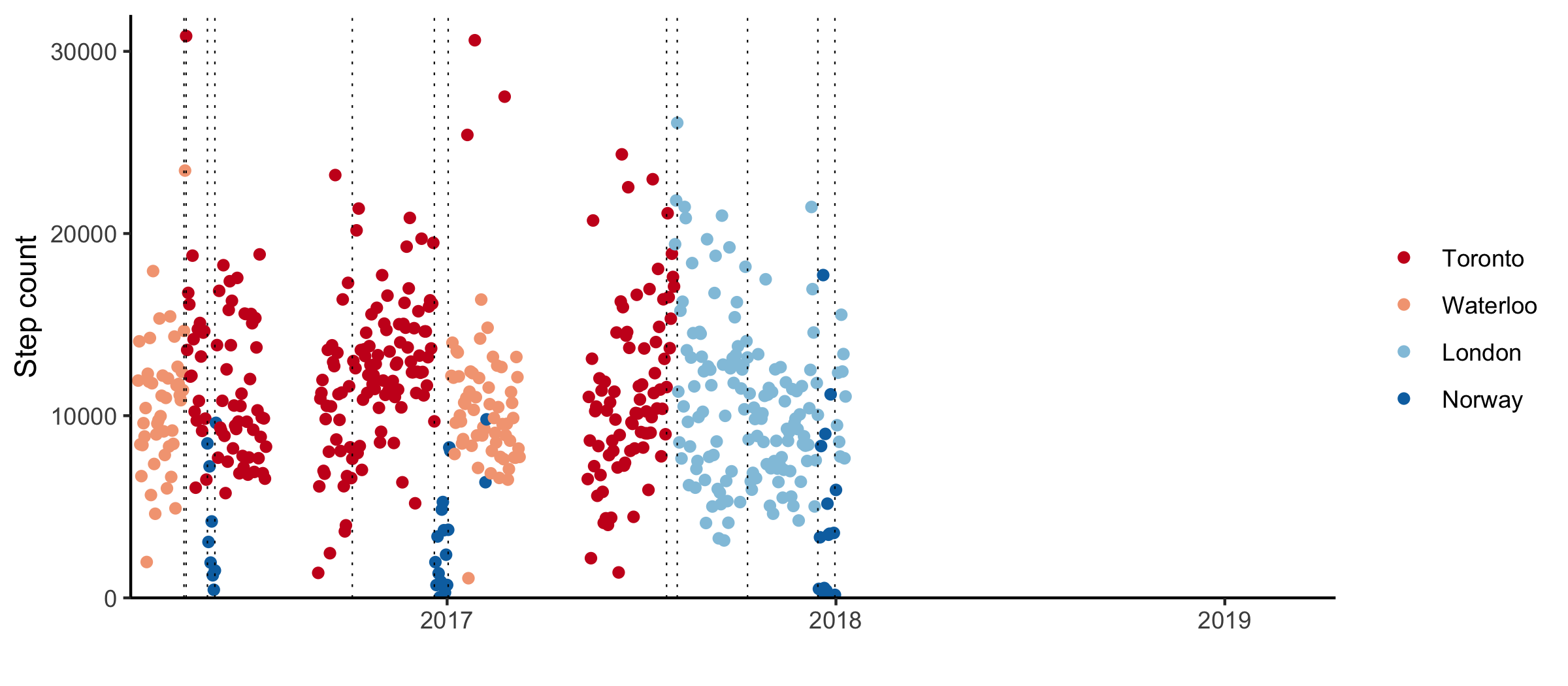 As I’ve meandered through the English speaking world, various devices and online accounts have been collecting data on my daily routines. I was curious to what extent a simple metric like daily step count can be used to identify major changes in my life.