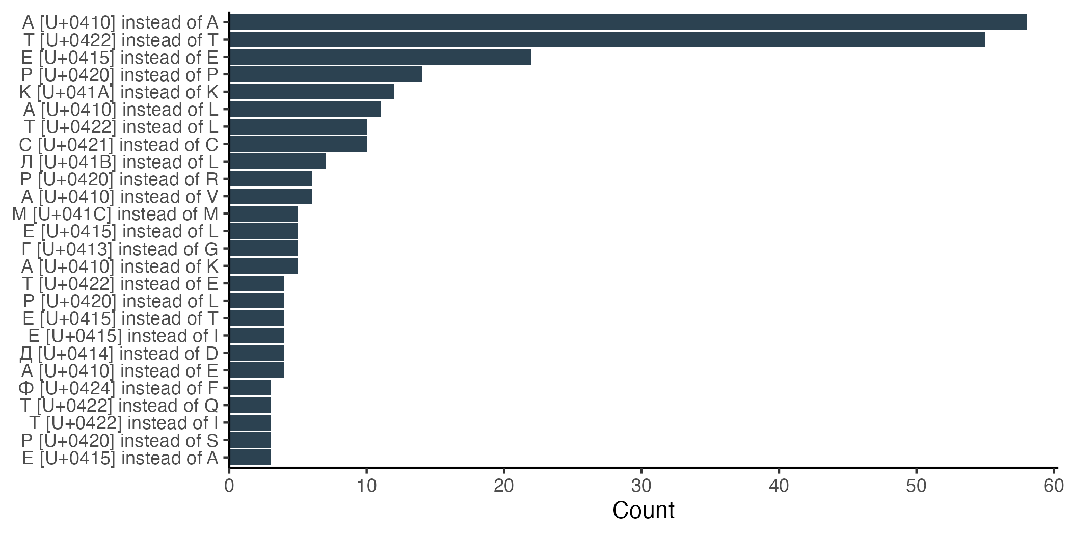 We can also ask which substitutions are actually occurring. The five most common Cyrillic substitutions swap a Latin letter for its visually indistinguishable Cyrillic counterpart. By far the most frequent substitutions are Cyrillic A for Latin A and Cyrillic T for Latin T. Notably, both of these letters can represent DNA bases as well as amino acids, and the Cyrillic versions are two of the most frequently used letters in Russian. Cyrillic E for Latin E ranks third, and is the most frequently used Russian letter that also doubles as an amino acid.