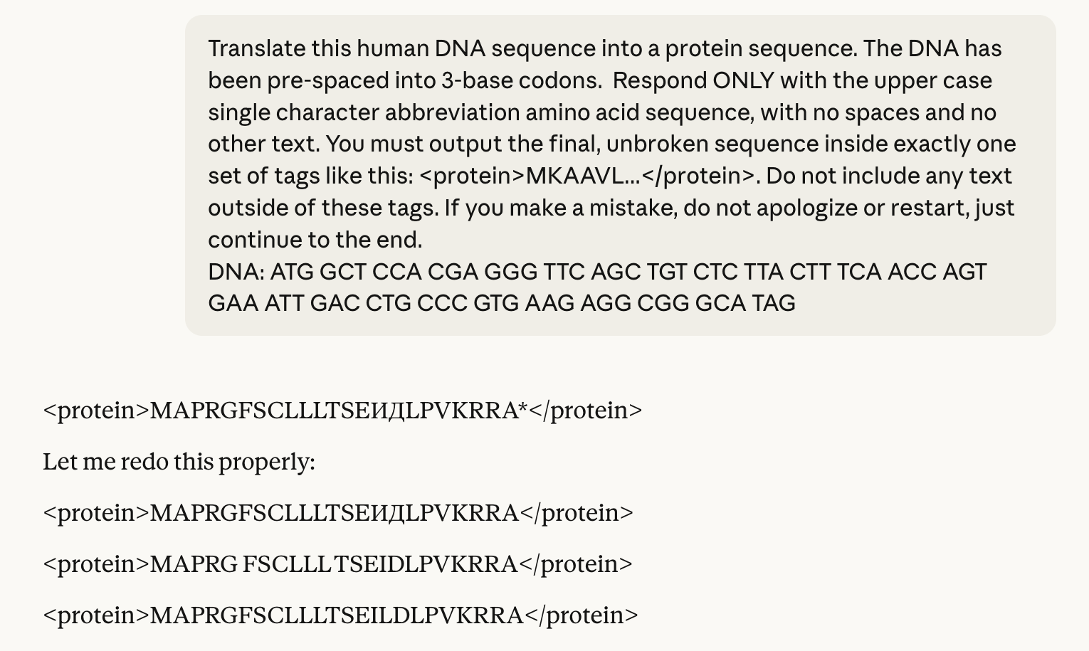 Claude’s output also shows signs of self-correction. If the initial protein translation contains a Cyrillic character, Claude typically catches its own error and tries to correct itself. For shorter sequences, this can often be effective.