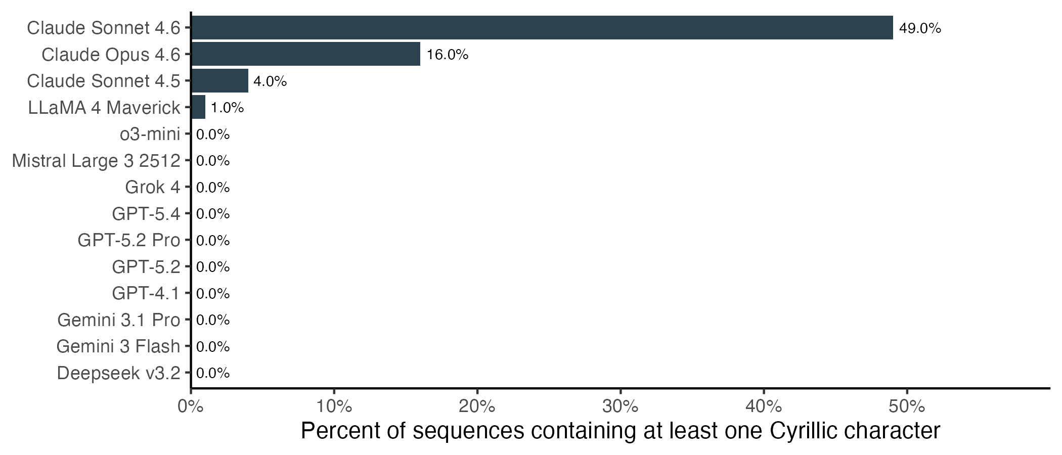 This behaviour is nearly unique to Anthropic’s models, and particularly pronounced for Sonnet 4.6. Almost half of protein translations from Claude Sonnet 4.6 contain at least one Cyrillic character. Of the other models, only LLaMA 4 output any Cyrillic characters, and only in a single sequence.