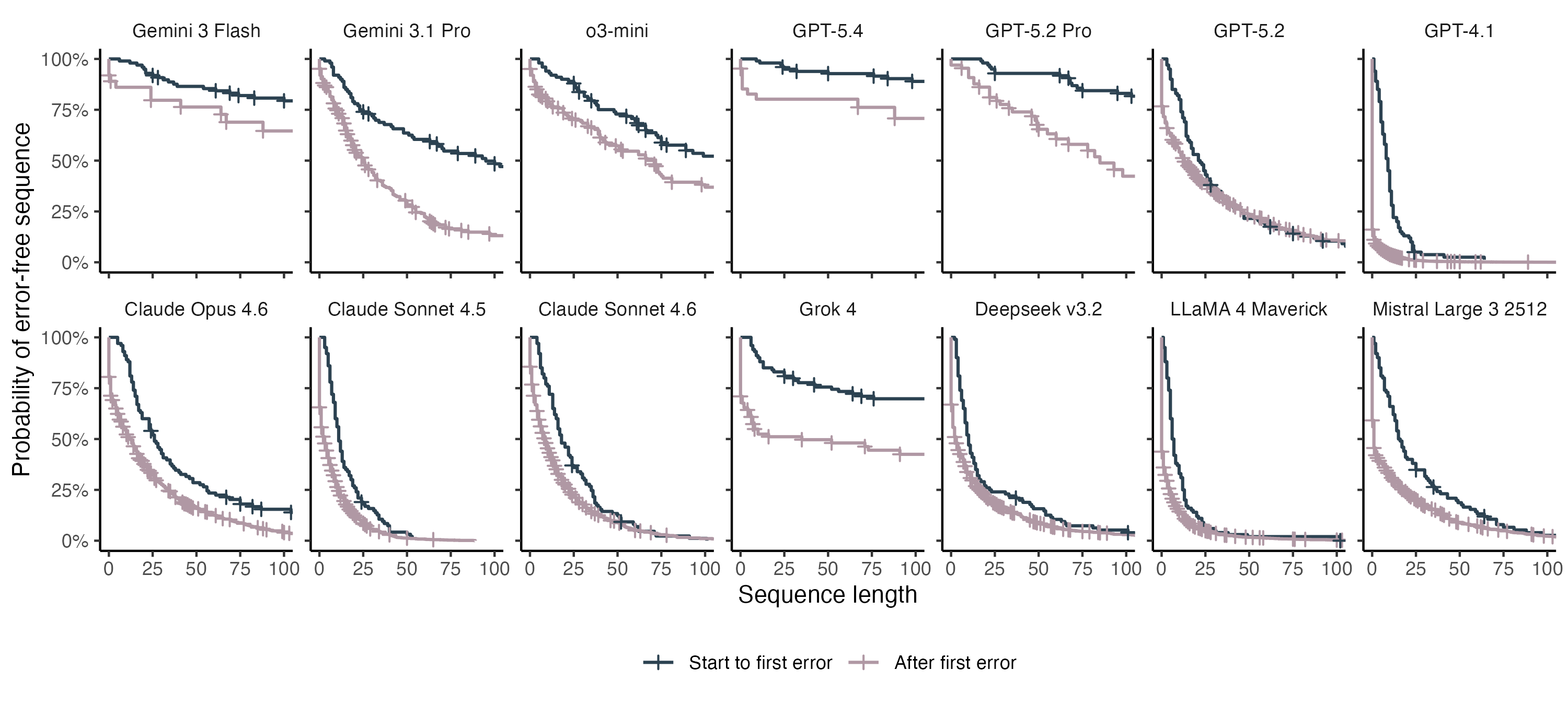 Another way to frame this is to ask how long of a string the LLM can handle before we expect to see the first error. For the lowest performing models, we can only expect to see ~10 correct amino acids before the first mistake. The best performers can output hundreds of correct amino acids, but still struggle with longer proteins. Once a single mistake is made, performance degrades for all models, and mistakes start happening at a higher rate.