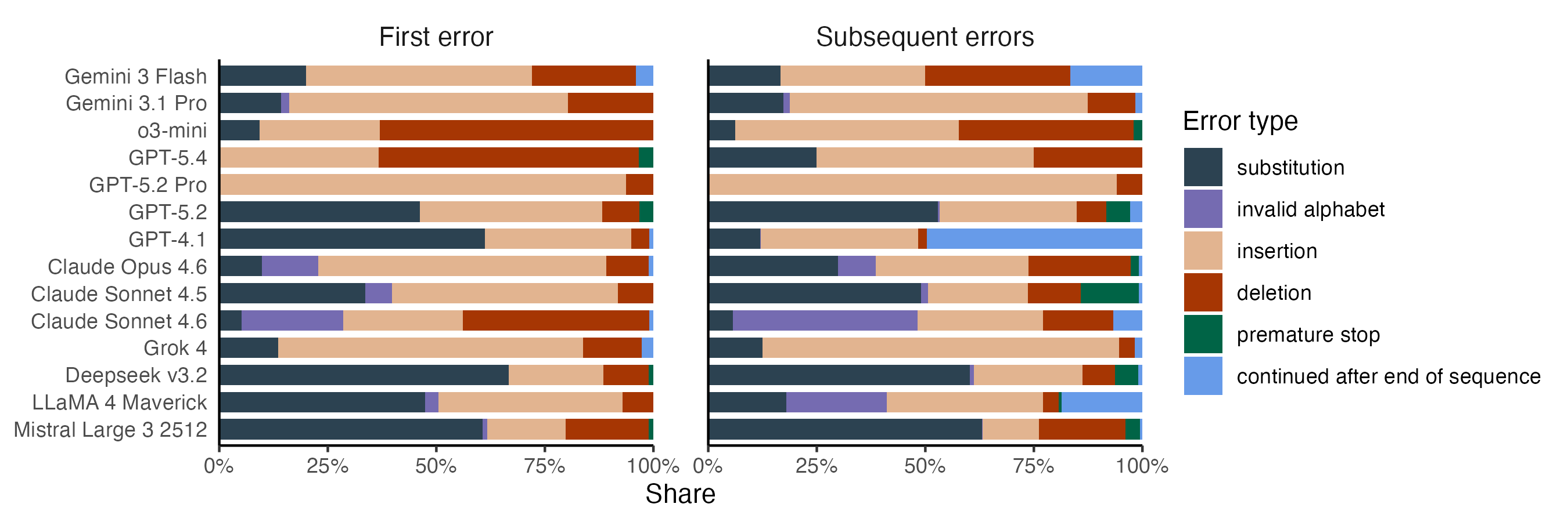 The best-performing models mostly make insertion and deletion errors. Substitution errors mostly occur with models that struggle overall, with DeepSeek and GPT-4.1 leading the charge. Anthropic’s models show much higher rates of invalid alphabet errors than the rest, a problem that’s especially pronounced after Sonnet 4.6 has made its first error.