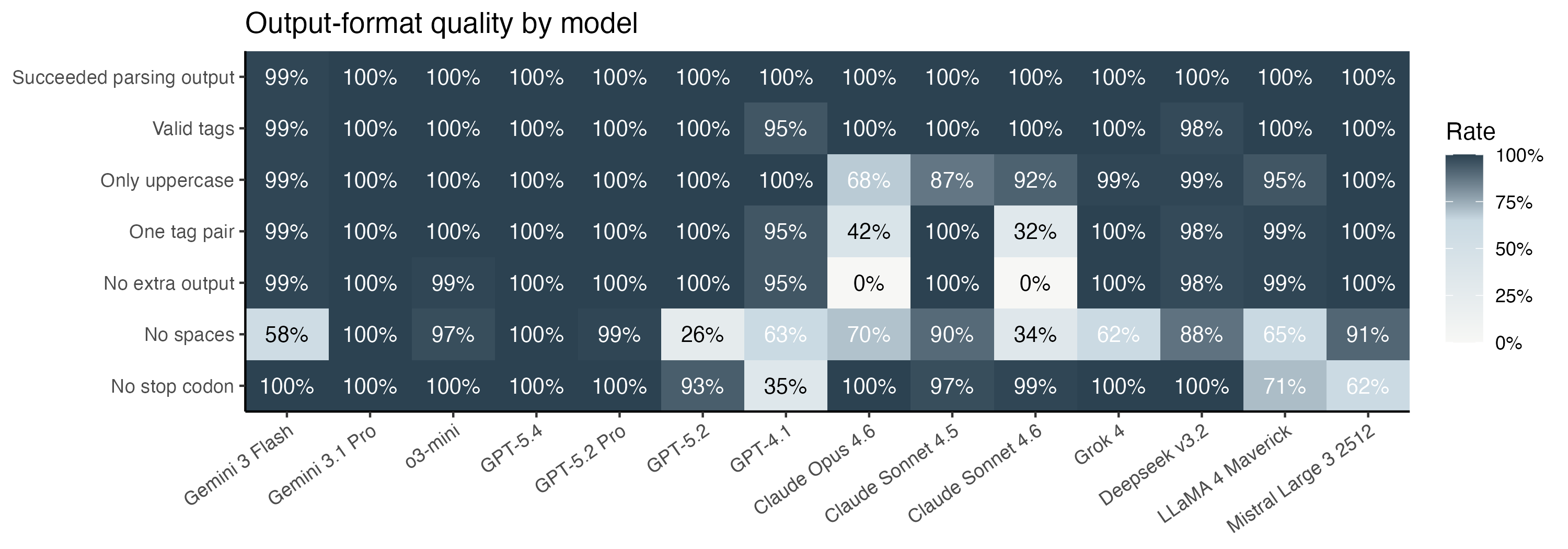 The rule compliance is summarized in the heatmap. Claude in particular refused my pleas for succinctness, and always started with a preamble about walking through the codons one by one.