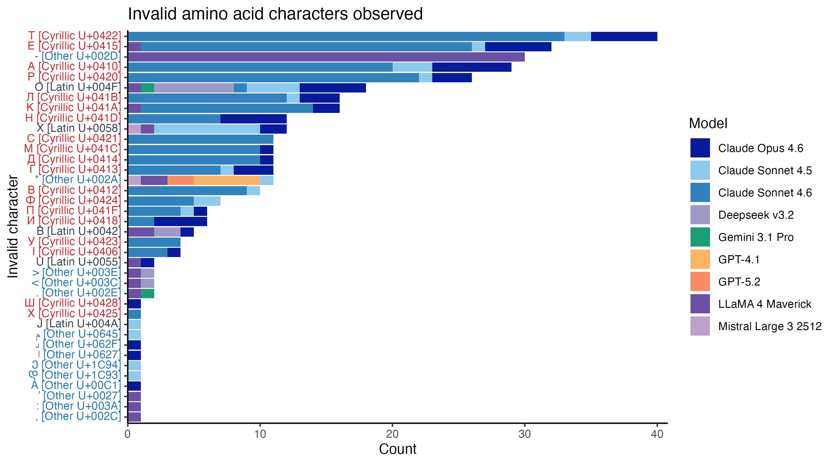 The failure taxonomy points to the strangest pattern in the dataset. Anthropic’s models have much higher rates of invalid alphabet errors than others. If we inspect the invalid characters directly, most come from non-Latin alphabets, with a particularly strong enrichment for Cyrillic. Four of the five most frequent invalid characters are Cyrillic characters that look identical to a valid amino acid character.