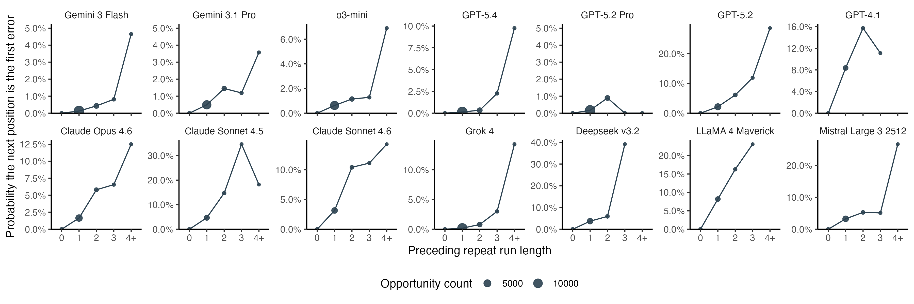 Errors, especially insertions, are more likely to happen after repeated amino acids. For amino acid output that has not yet had an error, we can look at the probability that the next character will be the first error as a function of the sequence context. For almost all models, the probability increases as the length of the preceding repeat run increases. This suggests the models are not merely bad at codon lookup, but tend to lose track of the position in locally repetitive contexts.