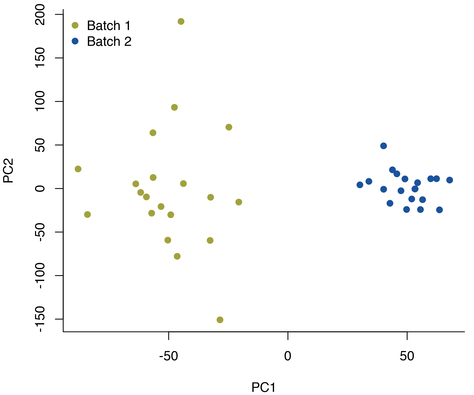 These batch effects can make it difficult to compare across groups of samples that weren’t processed in exactly the same way. For example, if the groups you’re interested in comparing aren’t evenly split across the batches, it can be difficult to disentangle any group differences from the batch effect. The problem has sparked a lot of research into statistical methods for adjusting for batch effects, and there are various R packages and other tools available.