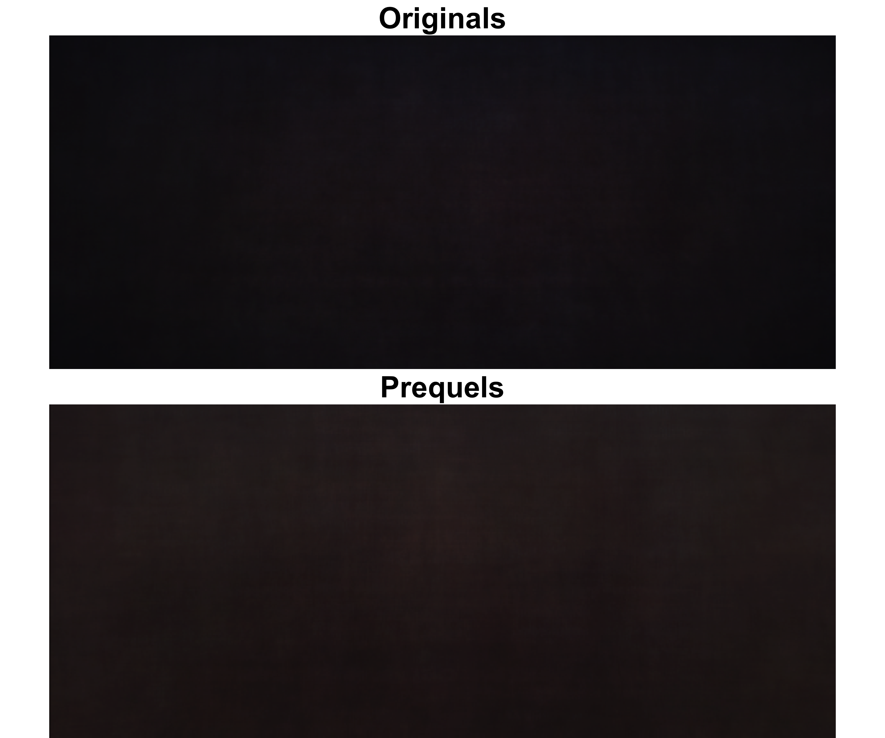 Not surprisingly, these average screenshots are boring. But they do give us some sense of the batch effect: the prequel screenshots seem to have lighter, more brown-ish colours. This is also clear from the \(t\)-tests: all of the tests with a \(p\)-value less than 0.05 had a higher pixel intensity in the prequels than the original trilogies.