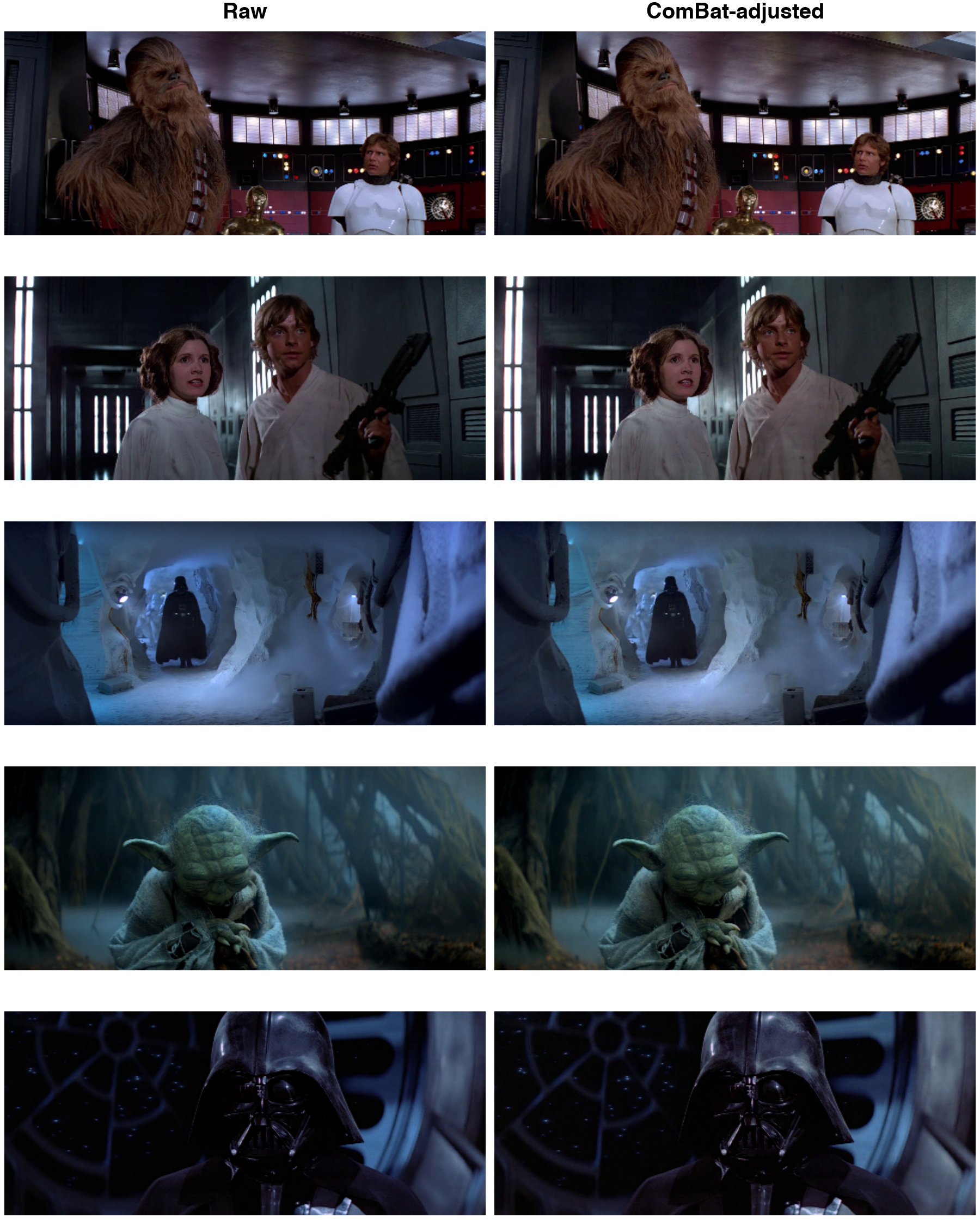 The screenshots above are all from the original trilogy, so we’d expect the ComBat-adjusted versions to have slightly warmer colours and less of a vignetting effect. The differences are subtle, but you can tell ComBat has made the window behind Darth Vadar brighter, for example.