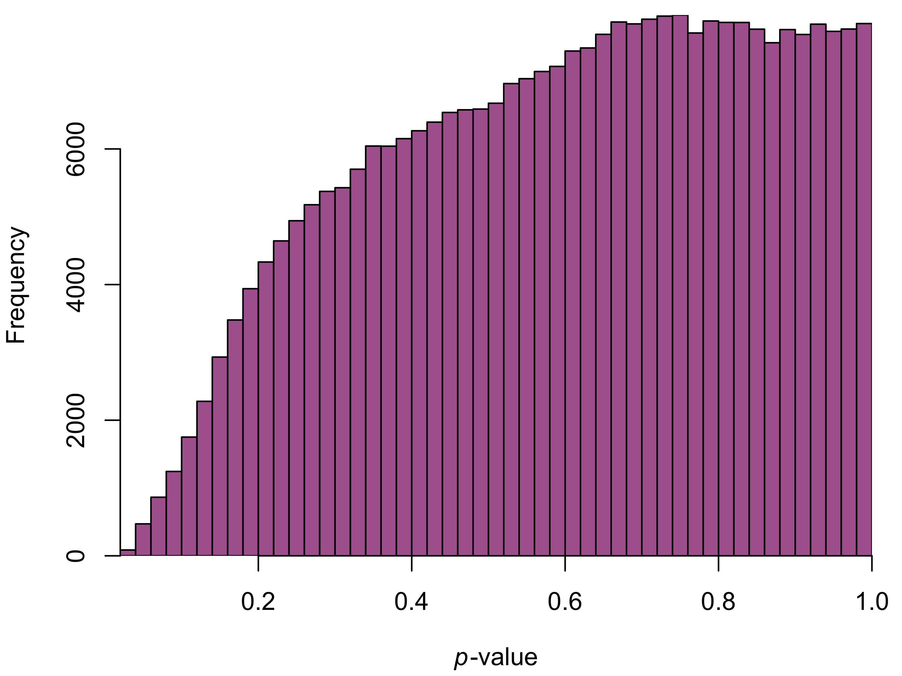 Unfortunately, the results aren’t quite what we wanted. While we’ve gotten rid of the huge peak on the left side of the histogram, we now have fewer small \(p\)-values than we’d expect by chance. ComBat seems to have over-corrected for the batches, leaving us with artificially small differences between the trilogies.