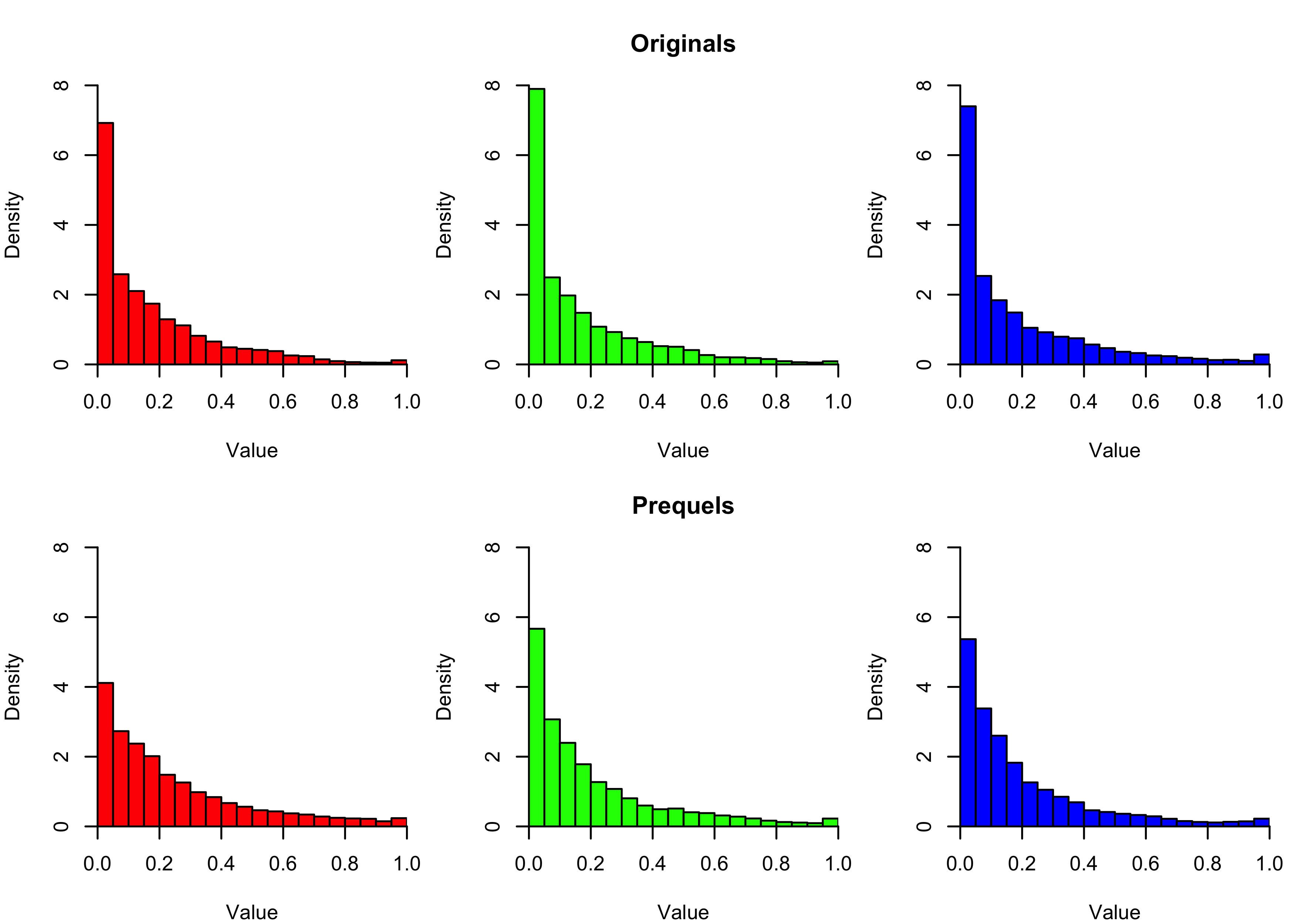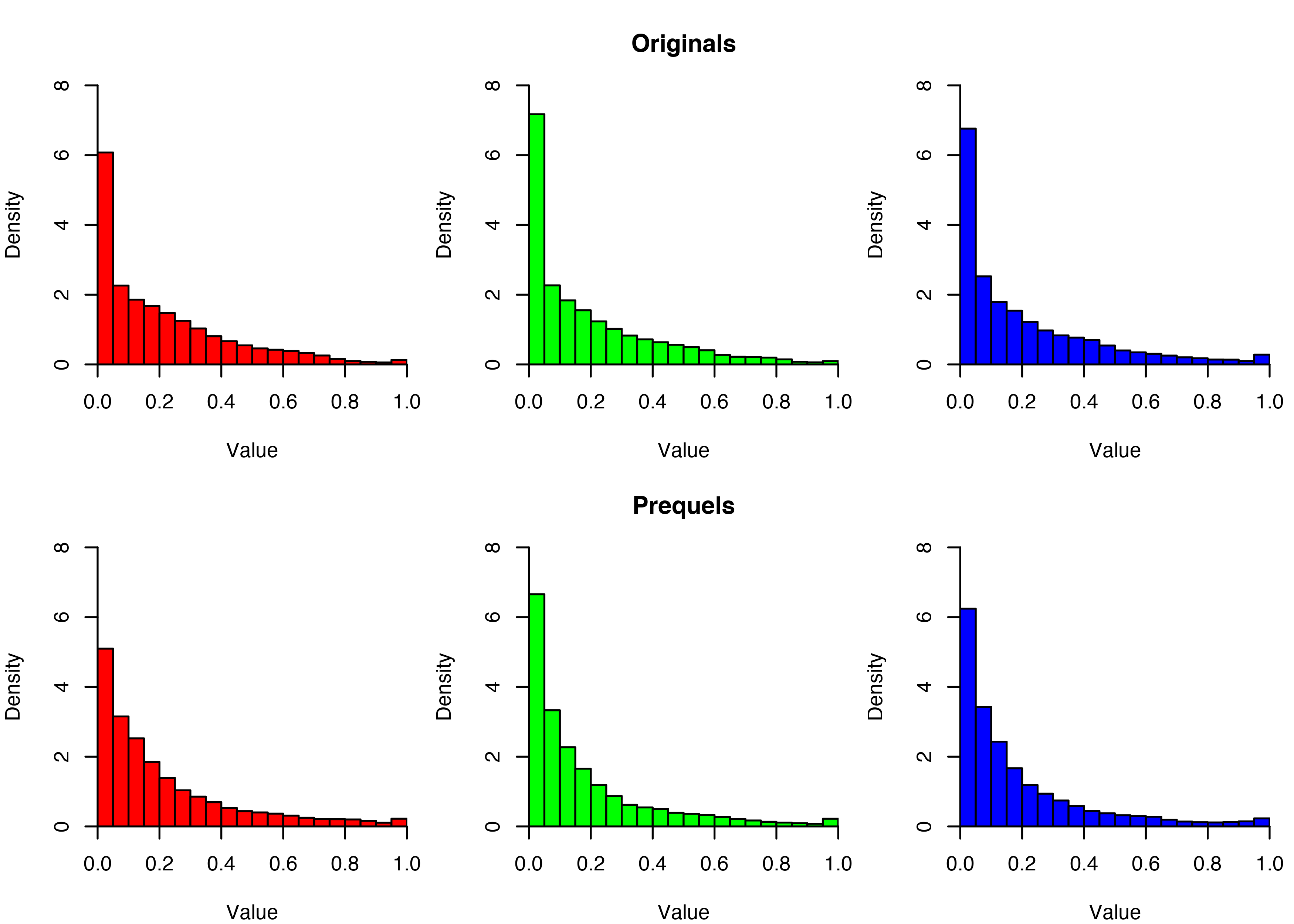 We can dig further into this by separating out the colour channels. The histograms below show the intensity values of each colour channel for each trilogy. Consistent with the average screenshots above, we see near-zero intensities are more common in the originals than the prequels.