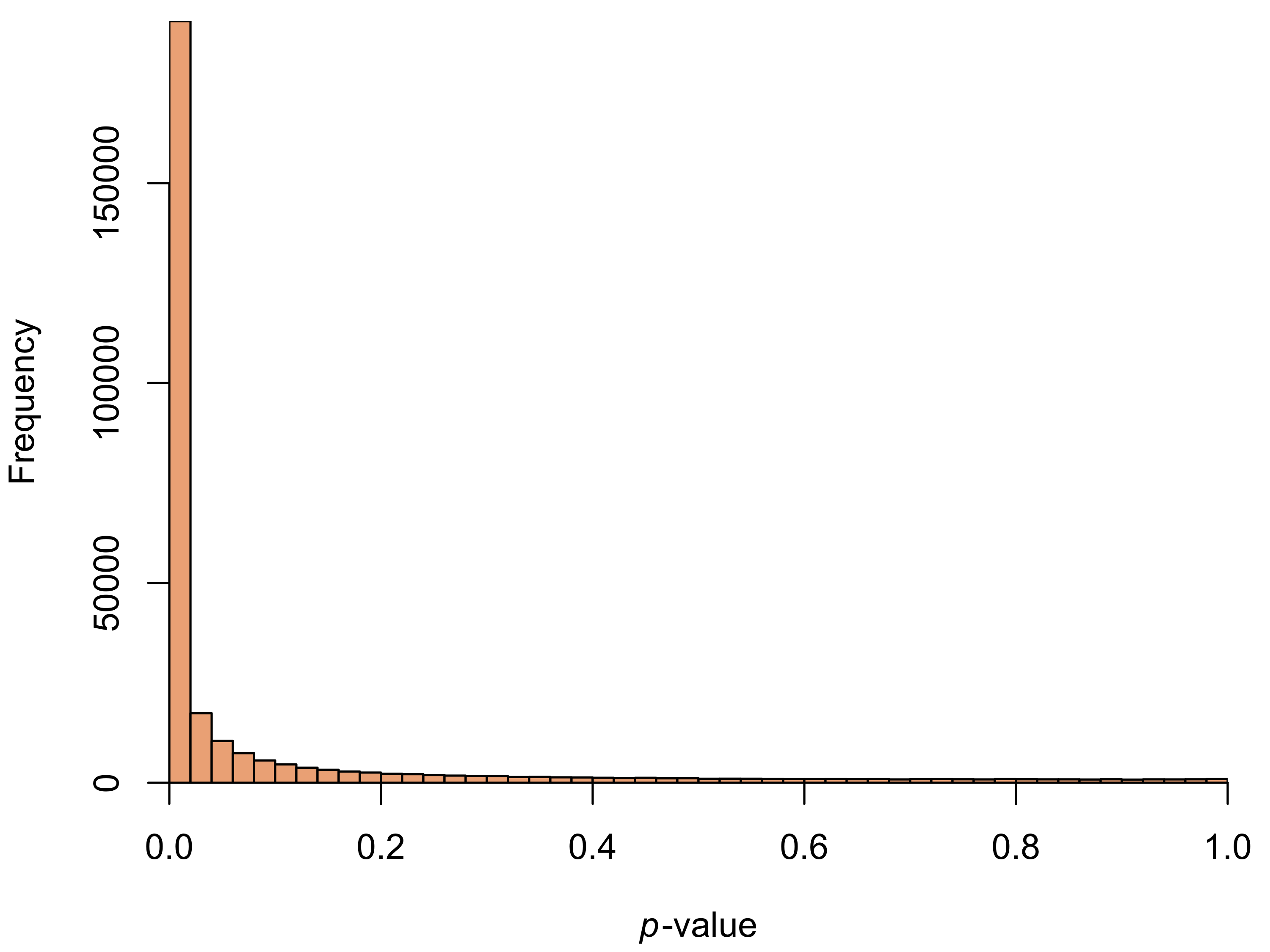 David Robinson has a great post on interpreting \(p\)-value histograms. Our histogram is a prime example of what he calls the “Hooray!” type: the large number of small \(p\)-values means we reject the null hypothesis for a large number of tests.2