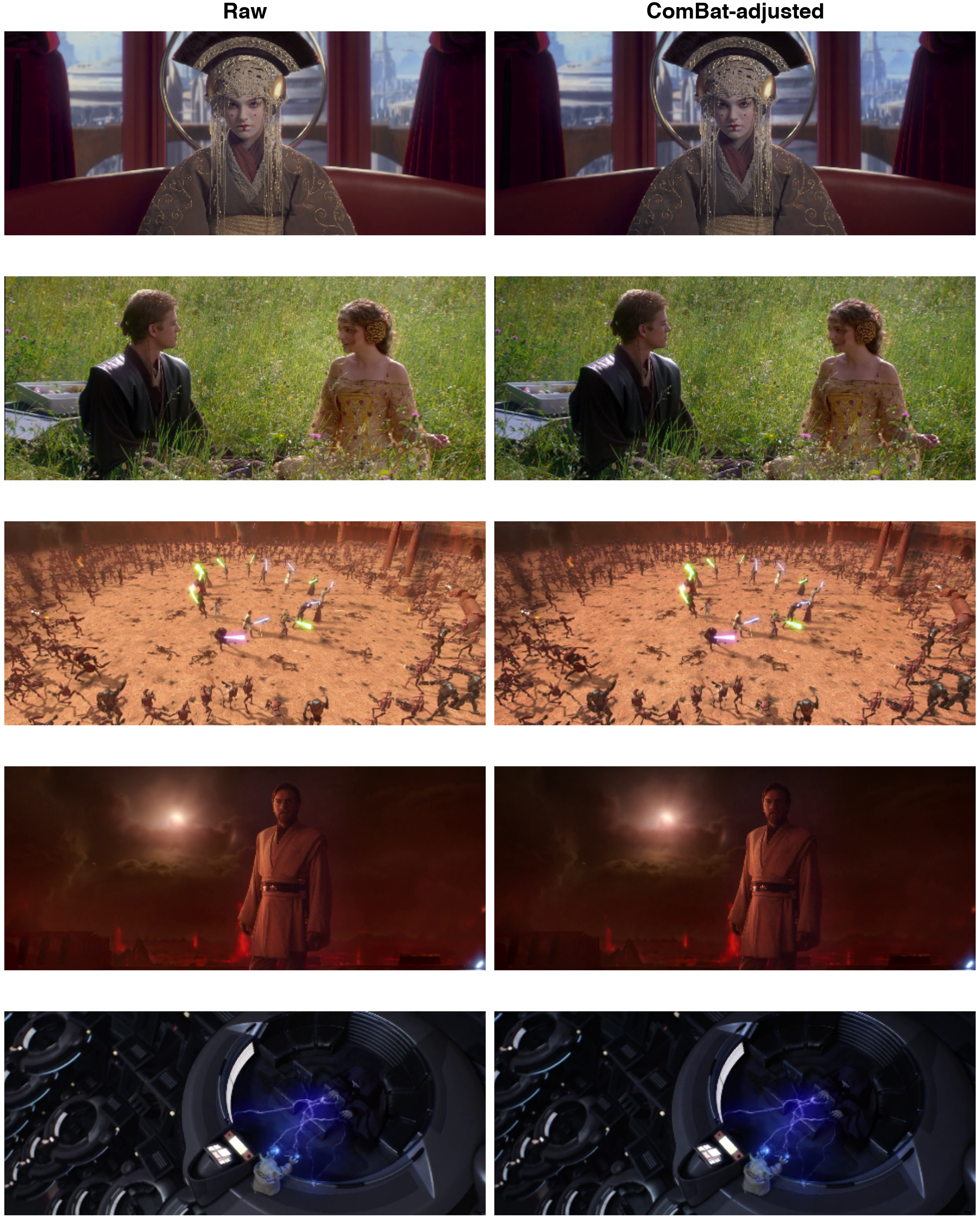 The most interesting part is to compare the screenshots themselves. The column on the left shows the original screenshot, with the right-hand side giving the ComBat-adjusted version.