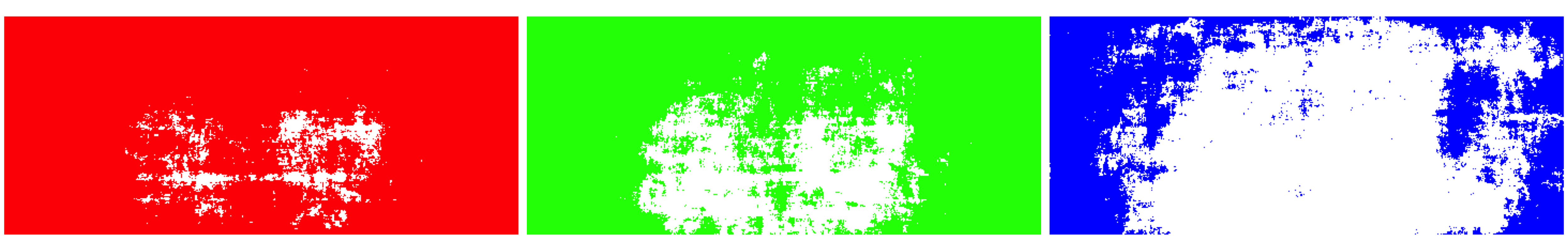 Another way of visualizing the differences is through the spatial arrangement of the differential intensity pixels. I considered the three colour channels separately, and plotted all pixels with a significant batch effect.