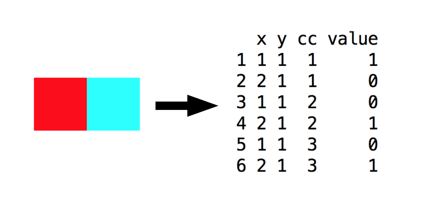 For example, a 2x1 pixel image can be stored as a data frame with six rows. The value column contains the colour intensity, and the other three columns specify the coordinates.