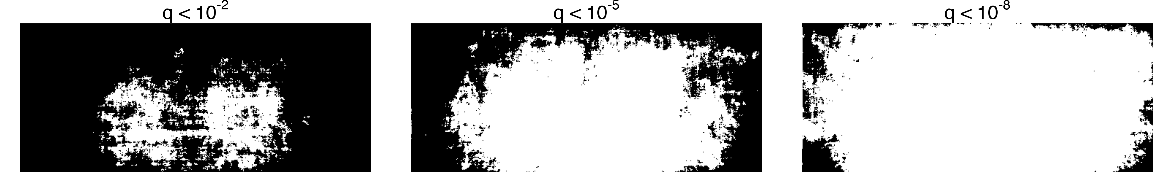 The corner effect becomes even clearer when you merge the colour channels and plot any pixel with a batch effect in any channel. Increasing the significance threshold clearly shows that the pixels closer to the edge of the screen have larger batch effects than the ones in the center.