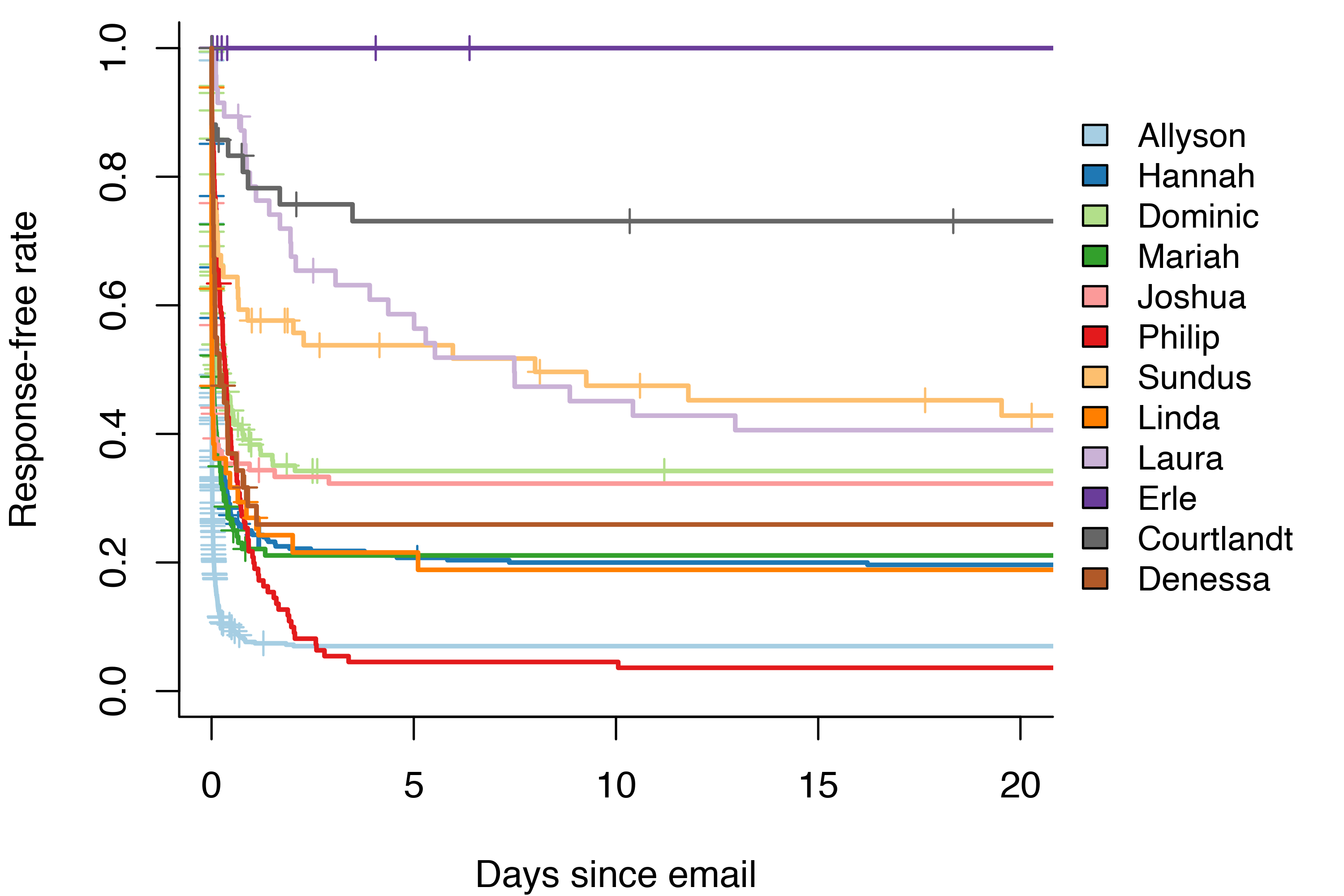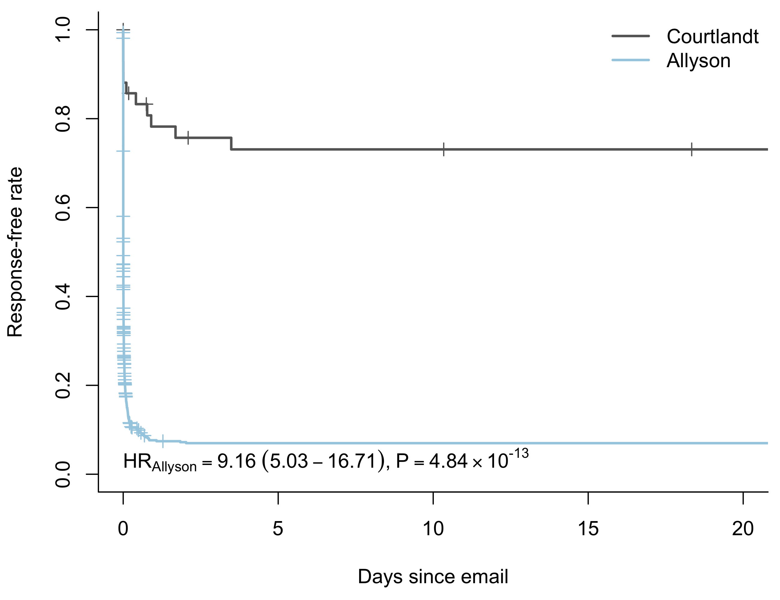 The exp(coef) column gives the hazard ratio. In the case of comparing Allyson’s response rate to Courtlandt’s, it’s 9.16. If I send the same email to both of them and wait for a response, in any given moment the estimated probability of Allyson responding is almost 10 times greater than the probability of Courtlandt responding!