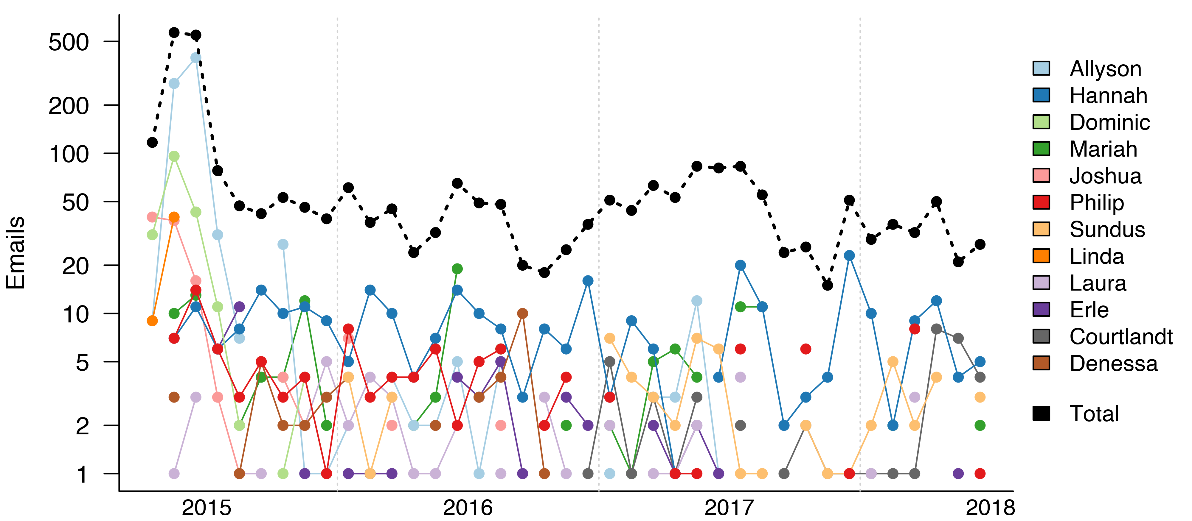 Of course, three years is a long time, and I haven’t been emailing everyone at the same rate. Most of my emails to Allyson and Dominic were sent in the summer of 20151. By contrast, I have been consistently emailing Hannah at a rate of around 10 emails a month for the past three years.