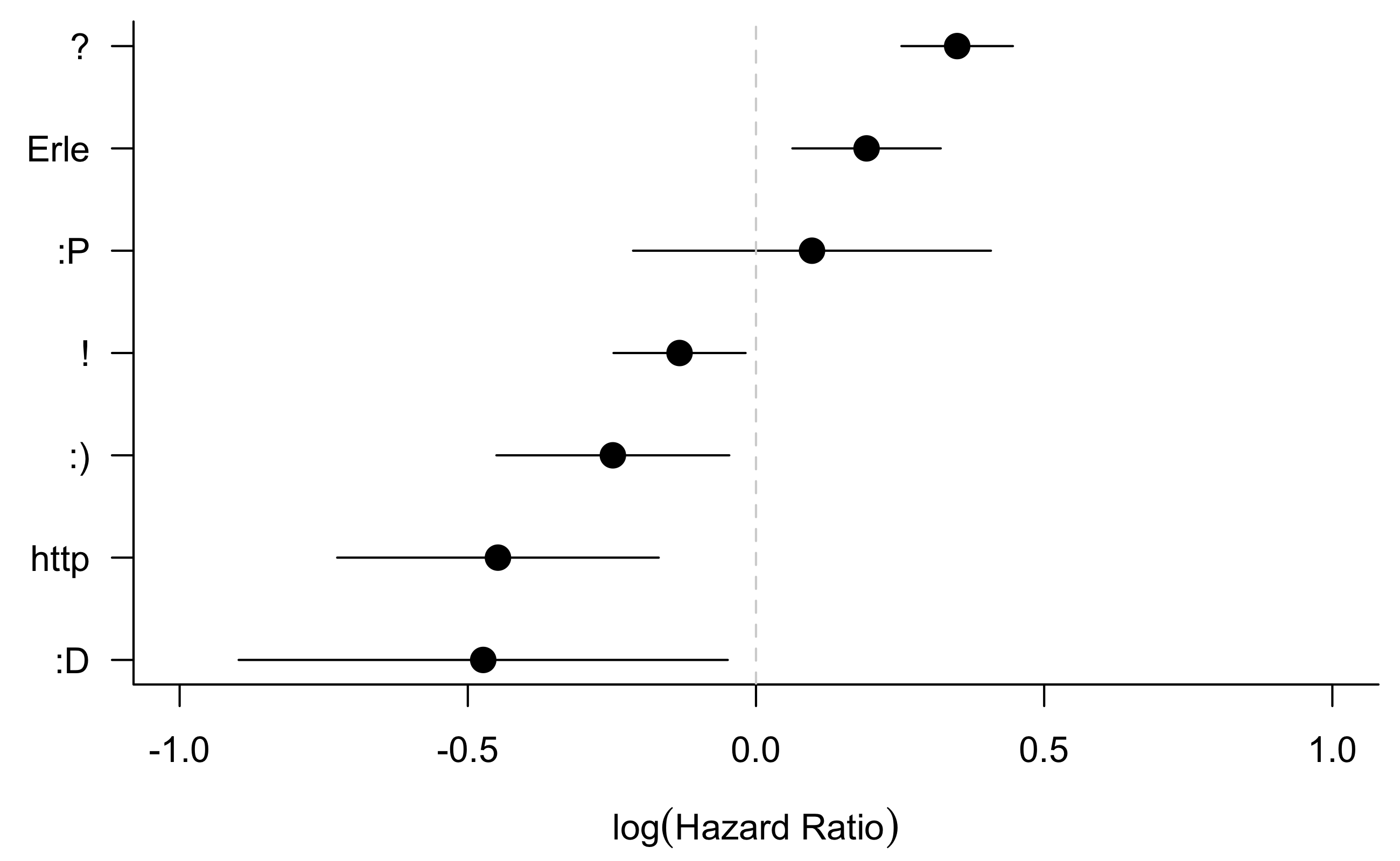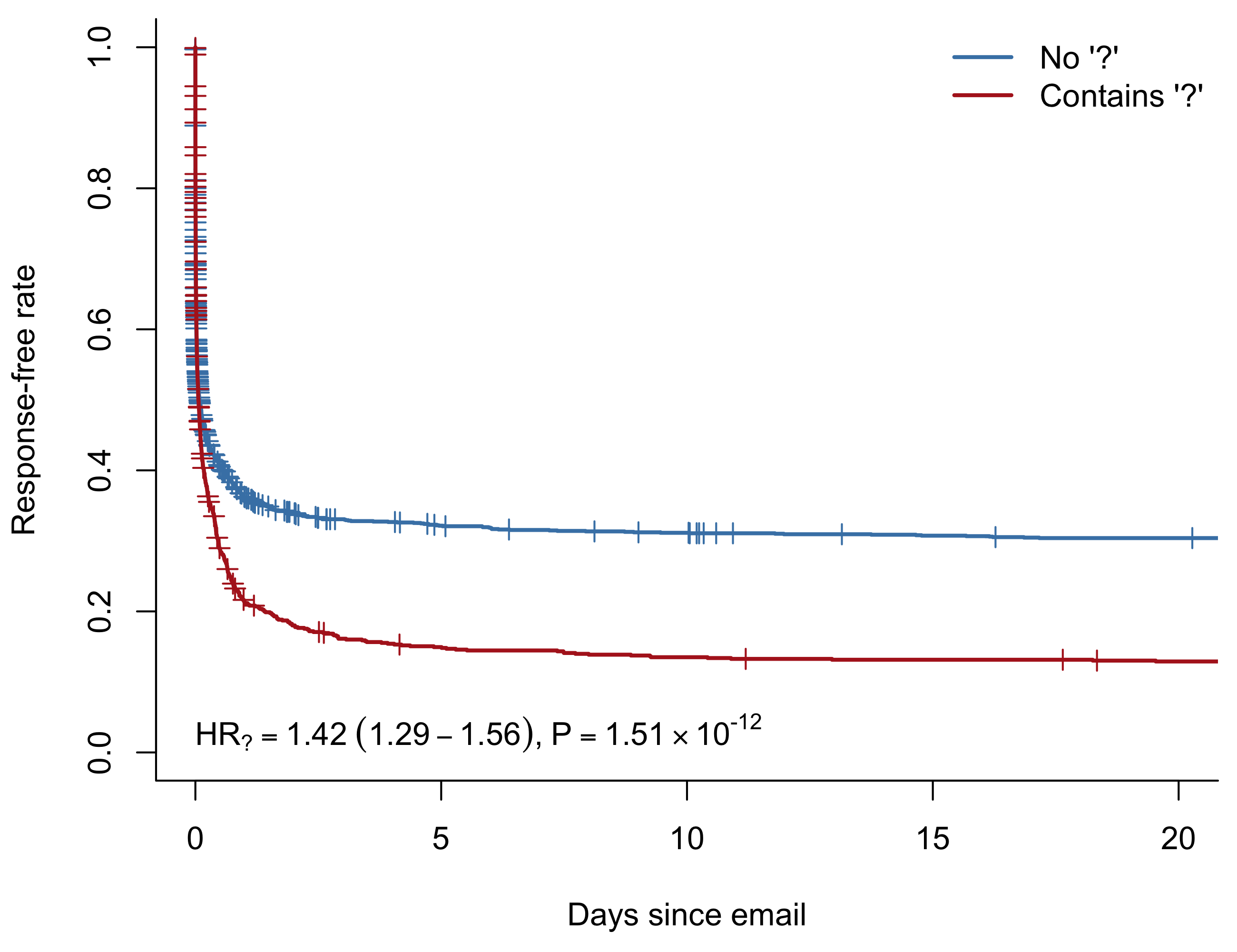 To test whether this might be the case, we can fit a new model stratifying on recipient. The stratification allows for the baseline hazard to be different for each individual. We still estimate the hazard ratio for including a question mark across all recipients, but we’re no longer limited by the proportional hazards assumption between individuals.