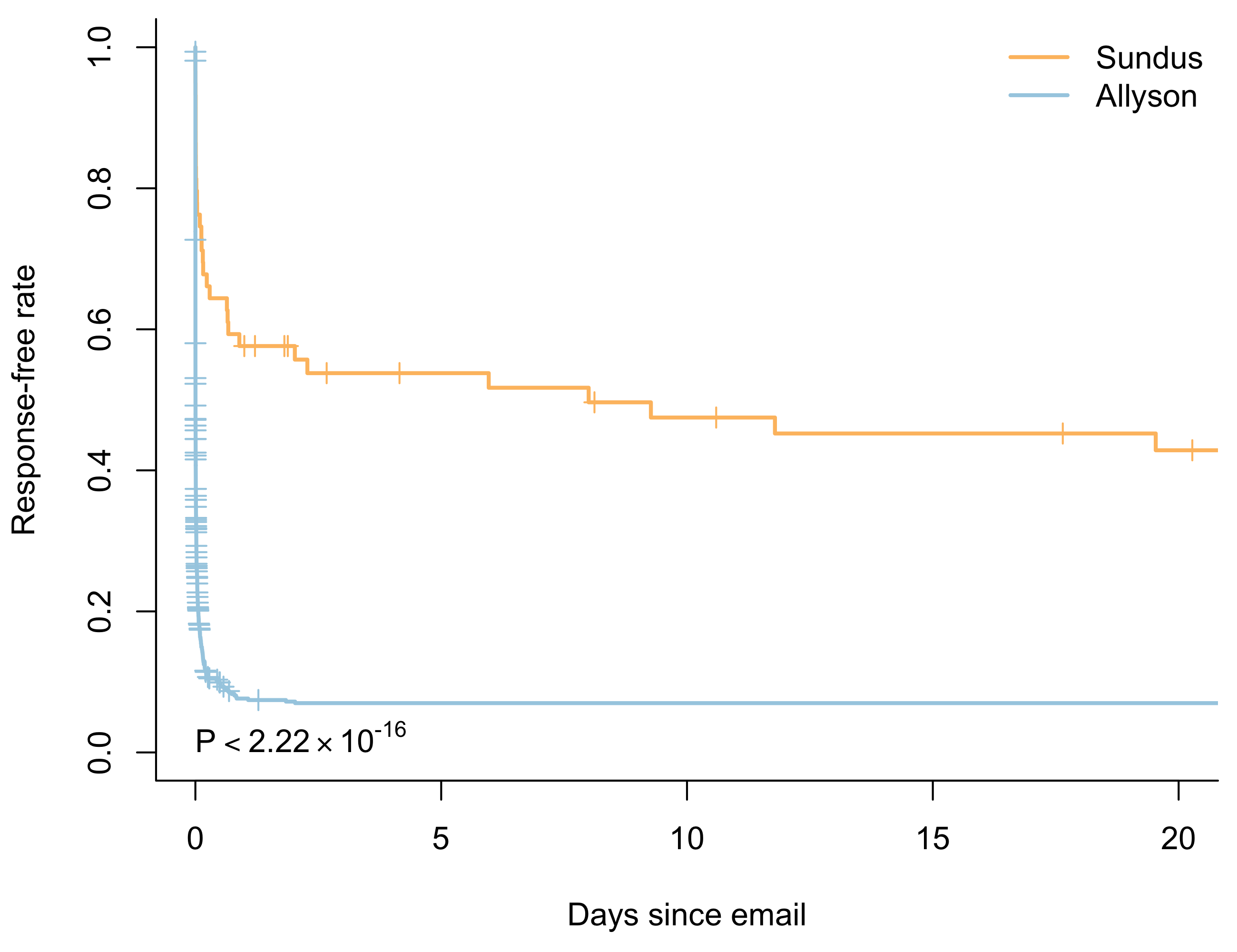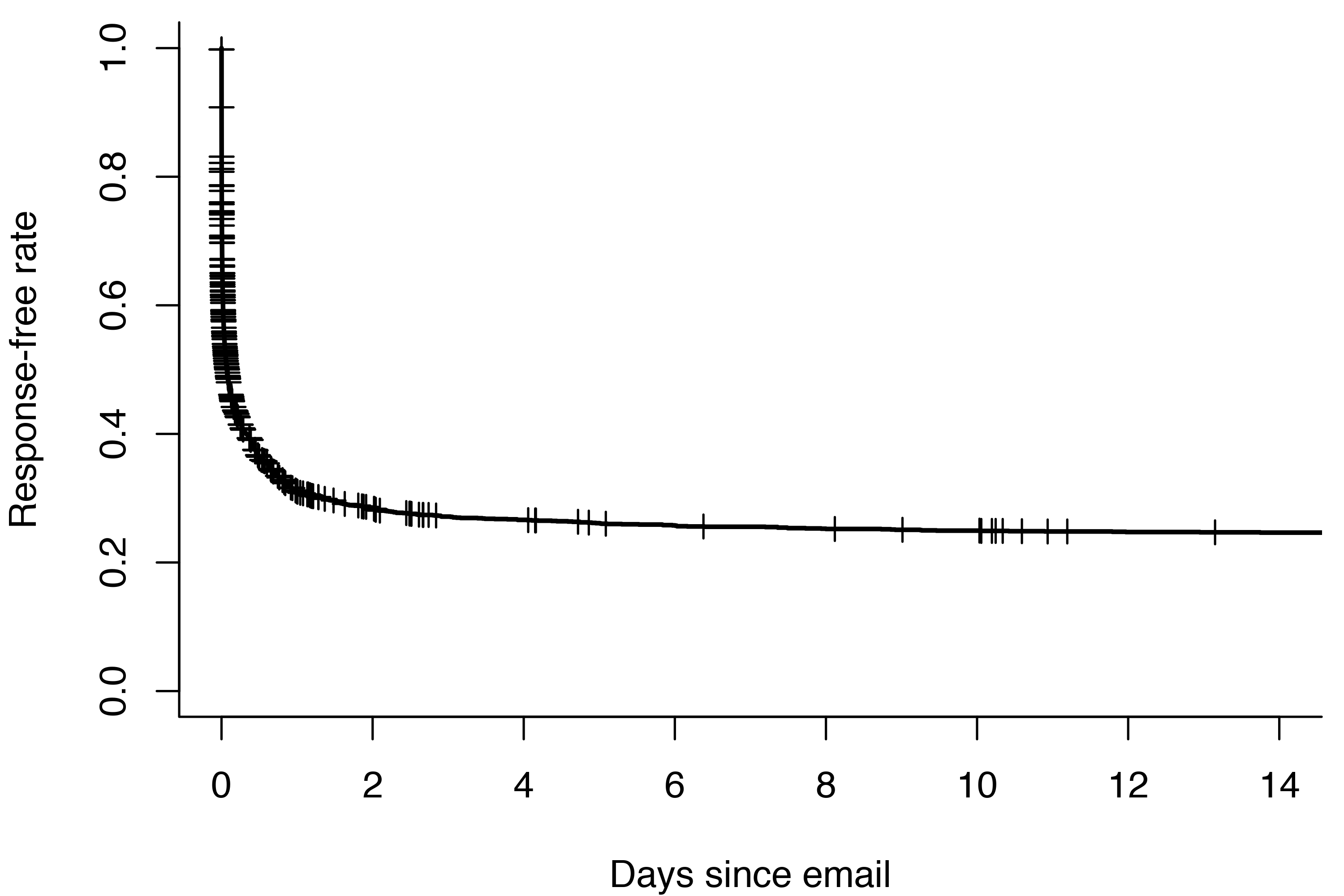Another option would be to use a recurrent event model. For the purposes of this post I have conveniently ignored the fact that sometimes I’m the one who doesn’t respond. People might have to send me several emails to follow up, giving me recurrent event data I could try modelling. Maybe next time!