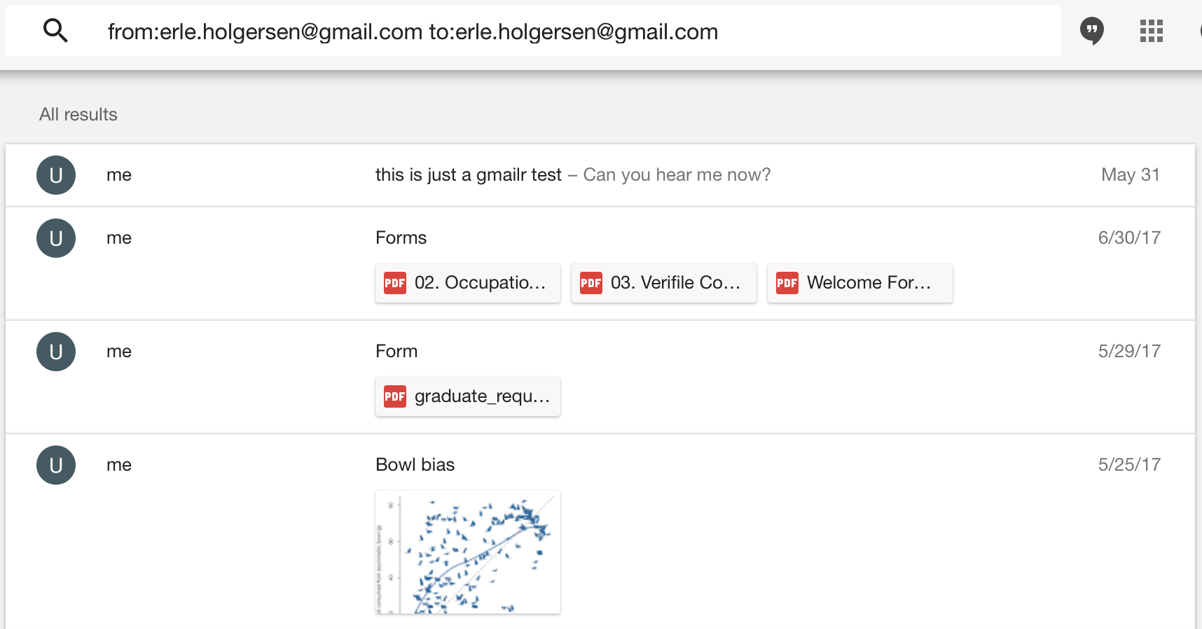 If you look carefully at the graph, you’ll see I’m my own 10th most frequent email target. I mostly send myself attachment-only emails, but there are some other use cases too. For example, the most recent self-email I sent was the result of Jenny Bryan’s gmailr tutorial.