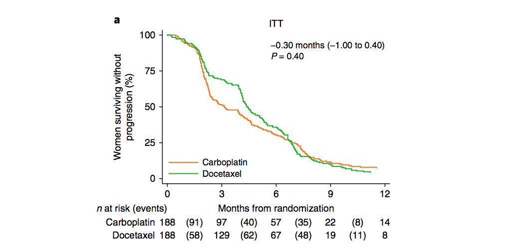 The Tripe-Negative Trial compared two types of chemotherapy in patients with triple-negative or BRCA-deficient breast cancer. The plot shows the proportion of patients in each treatment group whose cancer still hadn’t progressed after a certain number of months.