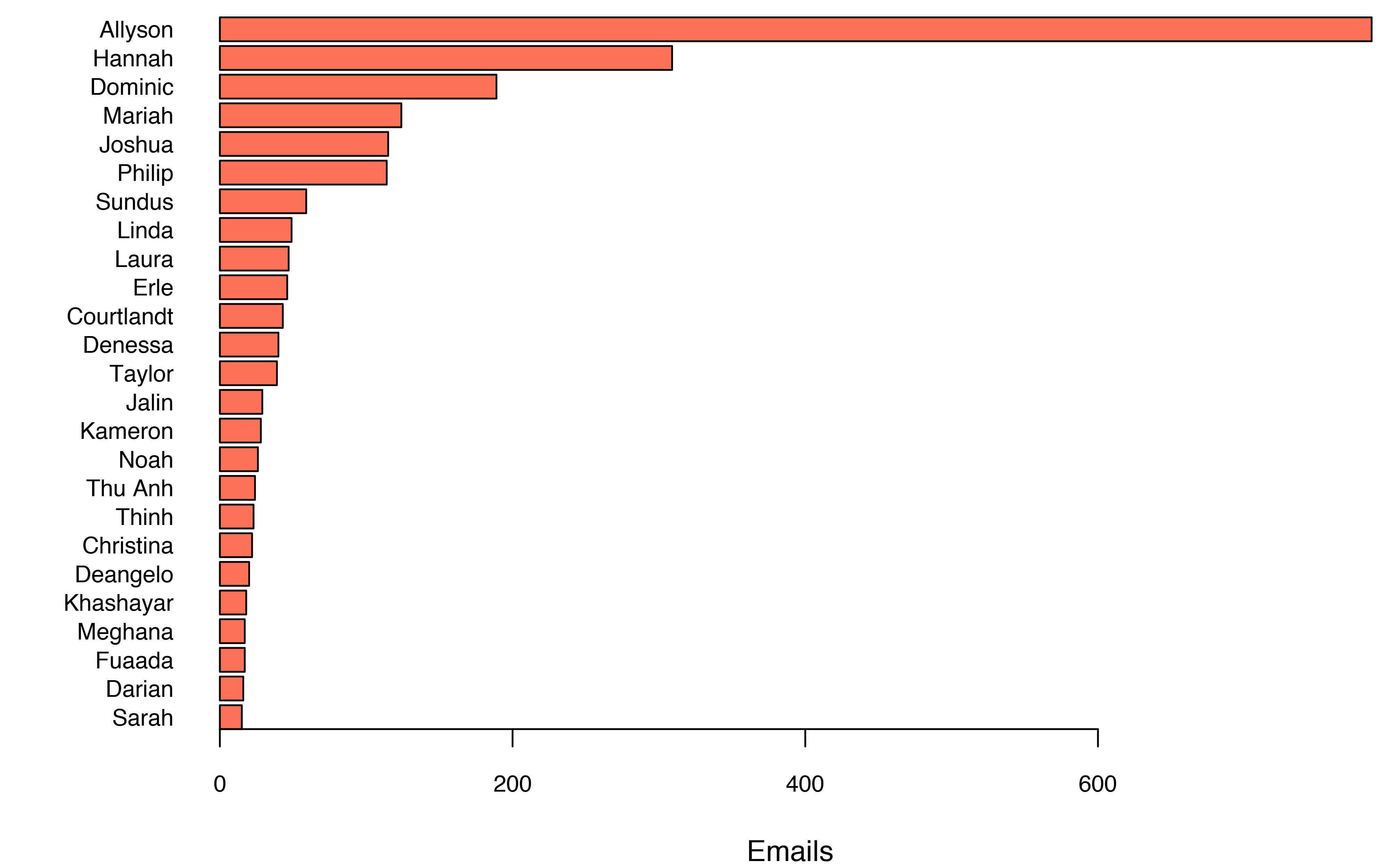 At this point, I also did a factor relevelling exercise to protect my own privacy. Instead of keeping all of the original email addresses, I changed all but my own into a random name from the randomNames package. With everyone’s identities hidden, we can start looking at who I’ve been emailing.